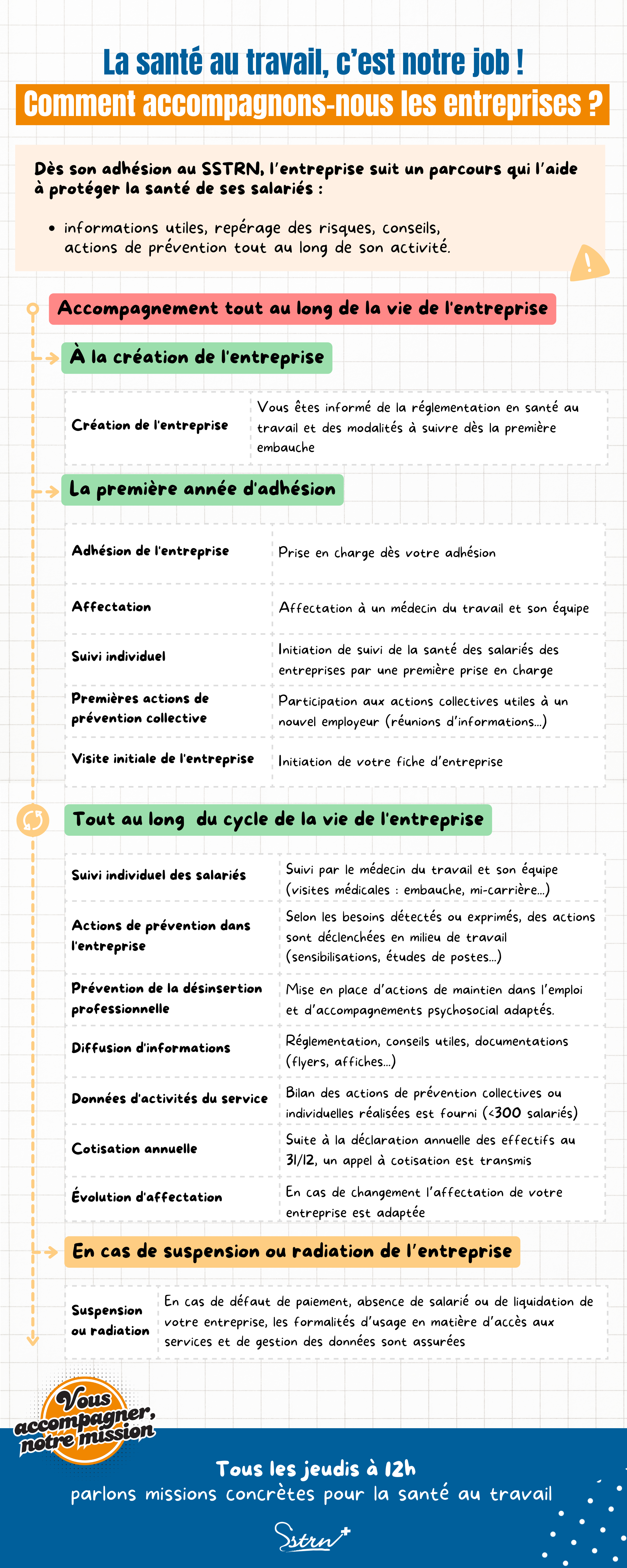 Dès l’adhésion d’une entreprise au SSTRN, un parcours global et personnalisé se met en place. Le SSTRN accompagne non seulement les nouveaux entrepreneurs en les informant sur les obligations réglementaires dès la première embauche, mais aussi tout au long du cycle de vie de l’entreprise.