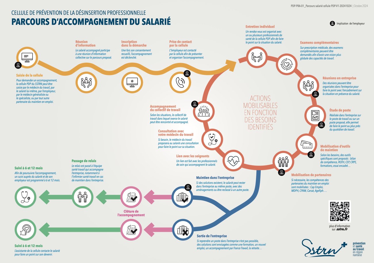 La cellule PDP propose un accompagnement auprès du salarié en risque de désinsertion professionnelle, de son collectif de travail et de son employeur, avec les partenaires de la PDP, les acteurs du soin ou d'autres si nécessaire.