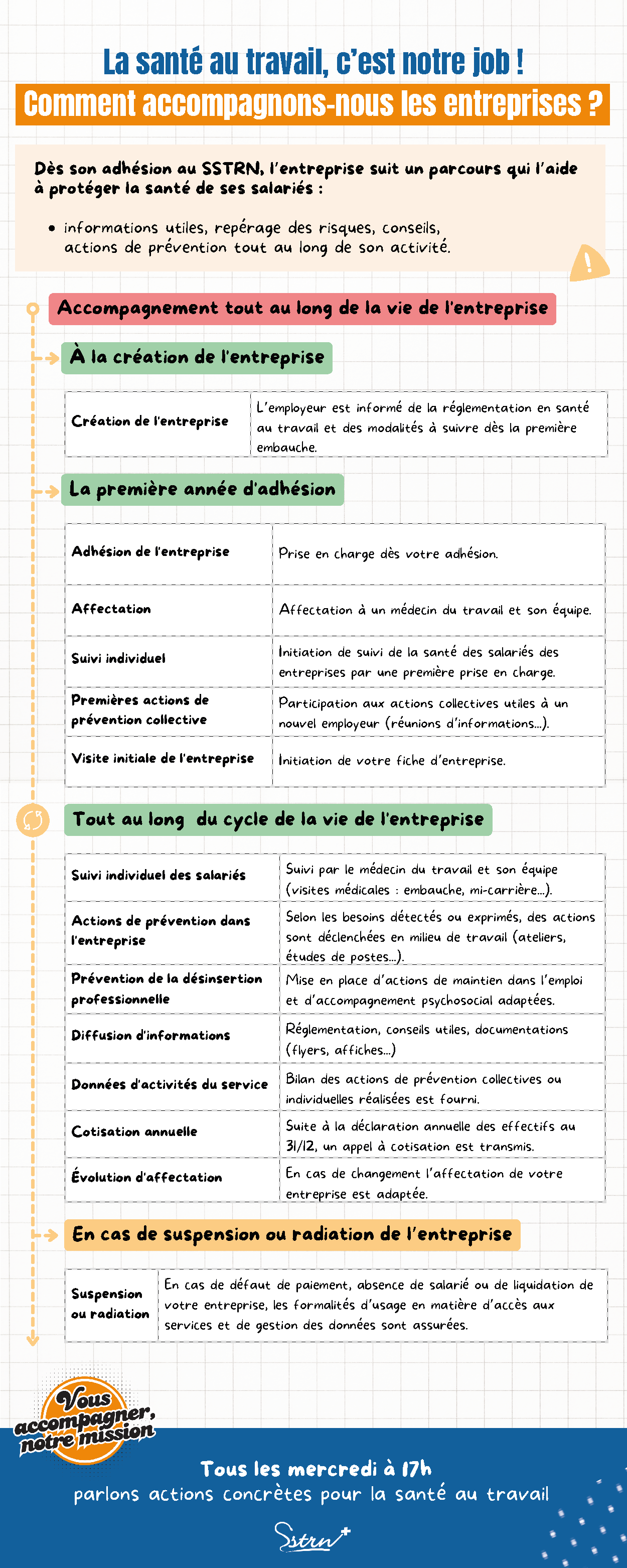 Dès l’adhésion d’une entreprise au SSTRN, un parcours global et personnalisé se met en place. Le SSTRN accompagne non seulement les nouveaux entrepreneurs en les informant sur les obligations réglementaires dès la première embauche, mais aussi tout au long du cycle de vie de l’entreprise.